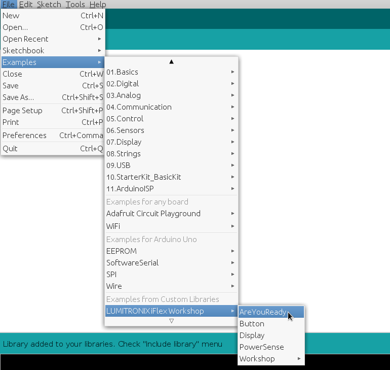 You might need to scroll down in the examples menu, since it tends to be fairly long. If you are not using the bundled IDE download above and do not see the LUMITRONIX iFlex Workshop item, make sure you have the LUMITRONIX iFlex Workshop library installed correctly.